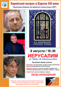 После этих презентаций появились статьи в израильской прессе, в которых говорилось о том, что книга «На Еврейской стороне улицы» явила собой уникальный литературный памятник, который создаёт неповторимый портрет народа с загадочной «еврейской стороны улицы» Европы – Восточной и Западной, куда авторы пригласили читателя заглянуть, чтобы он смог лично и близко познакомиться с малознакомым ему миром, приоткрыв тайну другого бытия. Гости на этих презентациях внимательно слушали авторов, большинству из них хотелось выразить личное отношение к заявленной теме и узнать мнение экспертов по животрепещущим проблемам: извечном еврейском вопросе; о современной политике; о демократии. Судьба «еврейской улицы» в Германии и, в целом, по Европе, волнует всех евреев и очень важно, чтобы «еврейская улица» не превратилась в «еврейский переулок» или даже в «еврейский тупик».